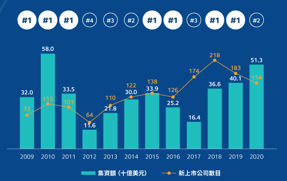 2020年盡管環(huán)球市場波動異常,但是港交所的一級市場仍領(lǐng)先全球IPO集資榜,共有154家公司在香港交易所上市,2020年首次公開招股集資額位列全球第二,集資金額達(dá)3,975億港元,是2010年以來最高,這主要得益于內(nèi)地紛紛赴港企業(yè)上市。