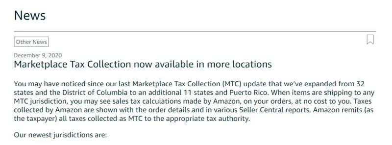 近日,亞馬遜美國站發(fā)布了一則有關(guān)在更多地區(qū)商城征稅(Marketplace Tax Collection)的公告,新增了11個(gè)需要由亞馬遜代收代繳銷售稅的地區(qū)。