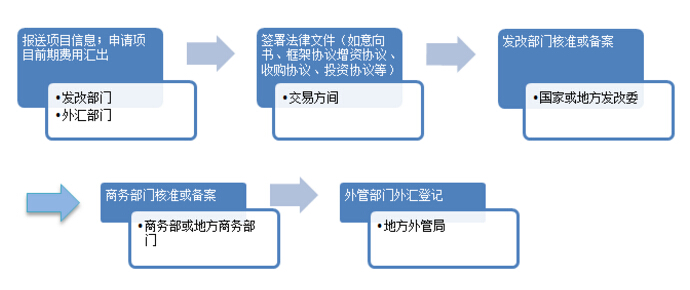 中國企業(yè)進行海外投資,主要需要取得三個主管部門的核準、備案或登記,包括國家發(fā)展和改革委員會或地方發(fā)展和改革委員會的核準或備案、商務(wù)部或地方商務(wù)部門的核準或備案、以及國家管理局地方分局(所在地銀行直接辦理,地方外管局通過銀行實施間接監(jiān)管)的登記程序。