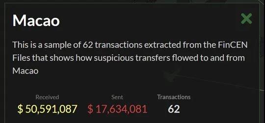 文件顯示有62宗“可疑交易”與澳門特區(qū)有關,有超過5000萬美元流入香港,1763萬美元從澳門流出。