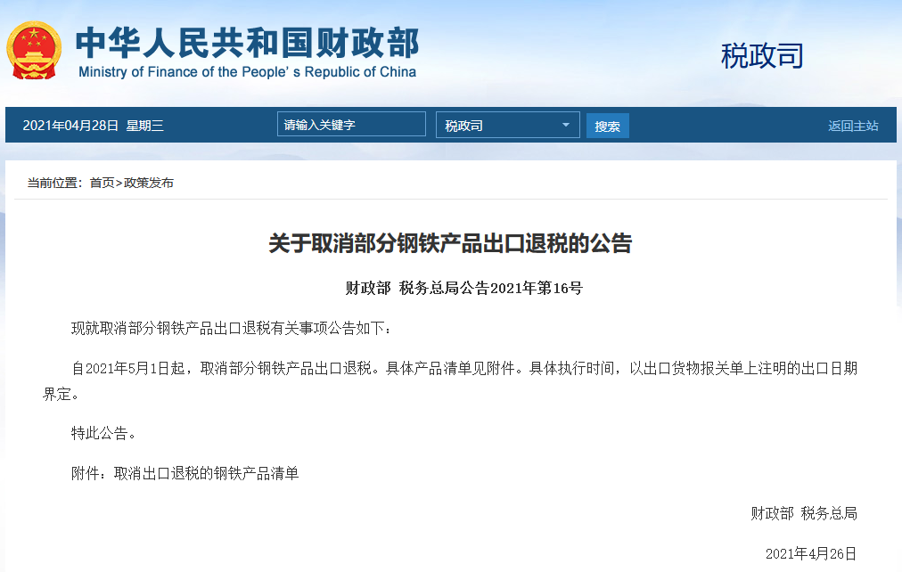 自2021年5月1日起,取消部分鋼鐵產(chǎn)品出口退稅。具體產(chǎn)品清單見附件。具體執(zhí)行時(shí)間,以出口貨物報(bào)關(guān)單上注明的出口日期界定。