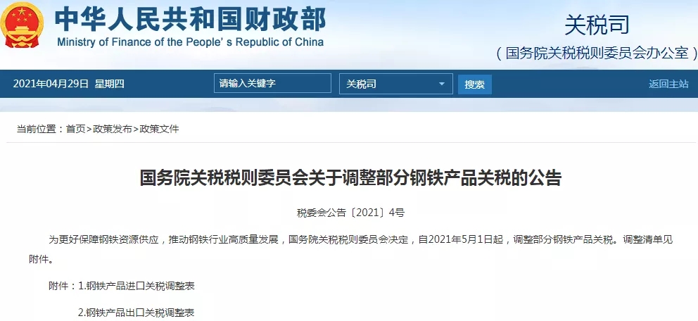 為更好保障鋼鐵資源供應(yīng),推動(dòng)鋼鐵行業(yè)高質(zhì)量發(fā)展,國務(wù)院關(guān)稅稅則委員會(huì)決定,自2021年5月1日起,調(diào)整部分鋼鐵產(chǎn)品關(guān)稅。調(diào)整清單見附件。