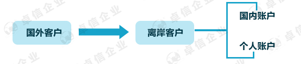 離岸賬號(hào)收到國(guó)外客戶貨款后,可將成本打給國(guó)內(nèi)進(jìn)出口公司核銷退稅,利潤(rùn)可轉(zhuǎn)個(gè)體工商戶結(jié)匯。如圖:
