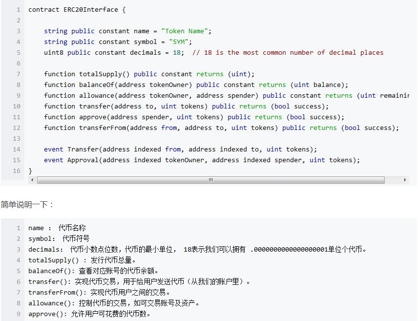 這邊還要介紹下ERC20,ERC20是以太坊定義的一個(gè)代幣標(biāo)準(zhǔn)。該標(biāo)準(zhǔn)要求我們?cè)趯?shí)現(xiàn)代幣的時(shí)候必須要遵守的協(xié)議,只有支持了協(xié)議才能被以太坊錢包支持。下面是協(xié)議代碼接口,看不懂沒關(guān)系,找個(gè)程序員都能搞定。