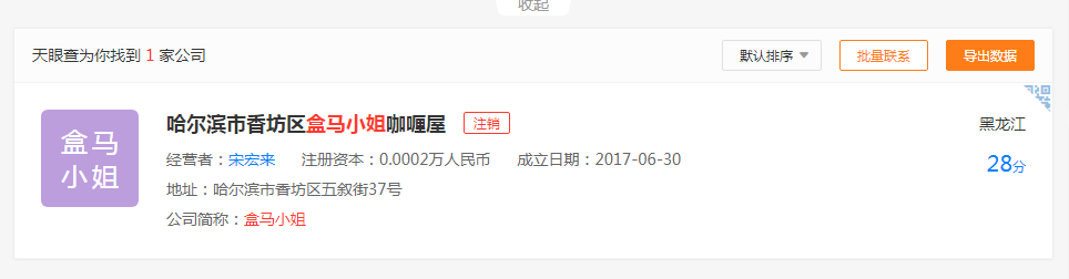 我們通過天眼查發(fā)現(xiàn),“盒馬夫人”、“盒馬爸爸”都是湖南每日三果貿易有限公司注冊,“盒馬兄弟”商標持有人是香港品牌集眾管理有限公司,“盒馬小姐”持有者是哈爾濱市香坊區(qū)盒馬小姐咖喱屋,目前該公司顯示已注銷。